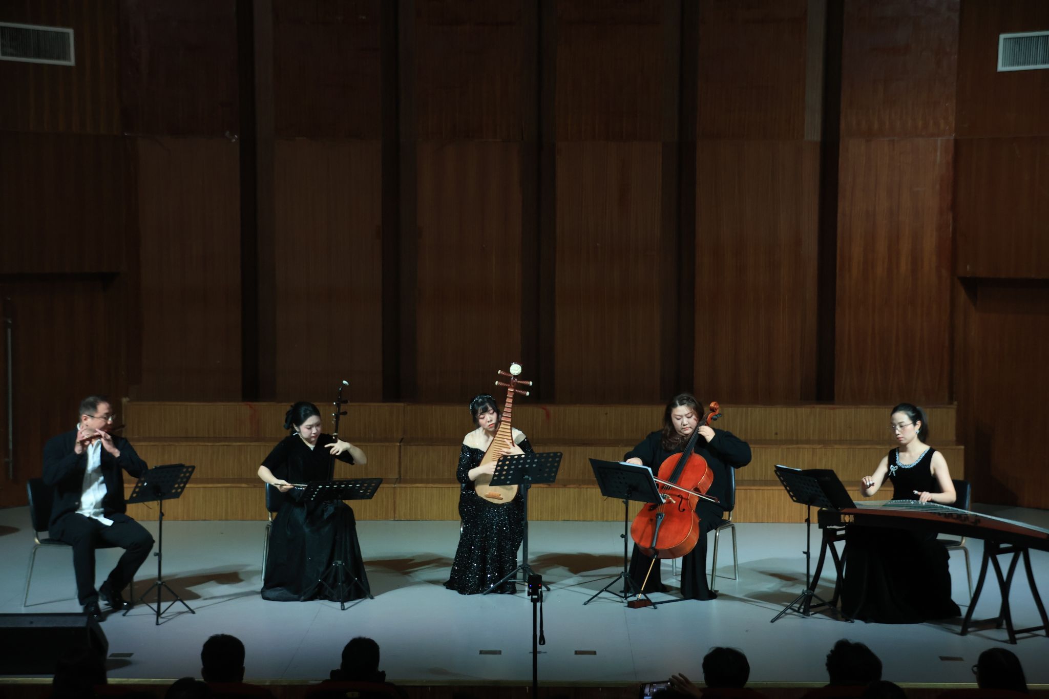 音乐会以“国风古韵”与“西乐华章”上下两个篇章展开,融汇中西,贯通古今。上篇“国风古韵”在安徽民歌联唱《凤阳变成金凤凰》中拉开帷幕,声声皖组合的演唱与钢琴伴奏相得益彰,充满浓郁地方风情。随后,民乐五重奏《江南风韵》宛转悠扬,箜篌独奏《箜篌引》空灵深邃,舞蹈《榫卯》则以刚柔并济的舞姿诠释传统智慧,尽显中华优秀传统文化的隽永魅力。下篇“西乐华章”则展现了音乐的多元与融合。男高音独唱《念奴娇·赤壁怀古》豪情万丈,室内乐《全新天地》《如愿》旋律动人。男中音独唱《不忘初心》深情真挚,男高音咏叹调《今夜无人入睡》荡气回肠。音乐会在合肥市如歌合唱团带来的合唱《燕歌行》《月之火舞》中达到高潮,精湛的演绎、丰富的艺术形式赢得了全场经久不息的热烈掌声。