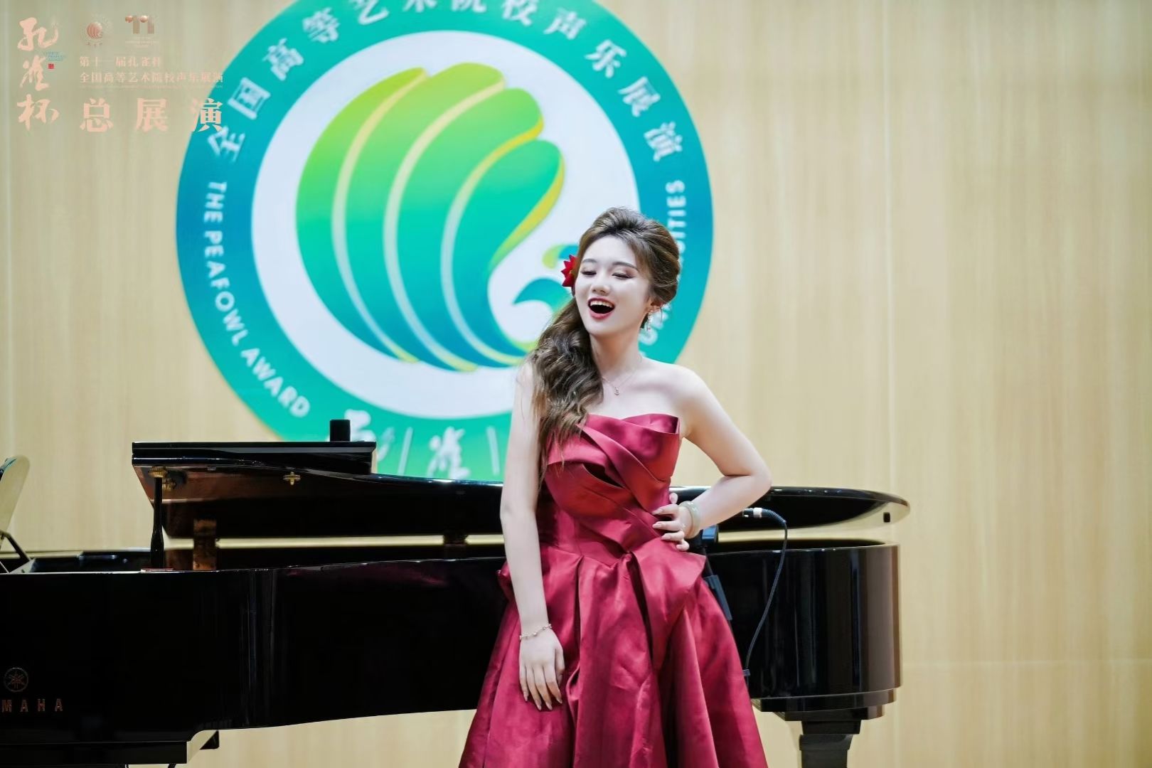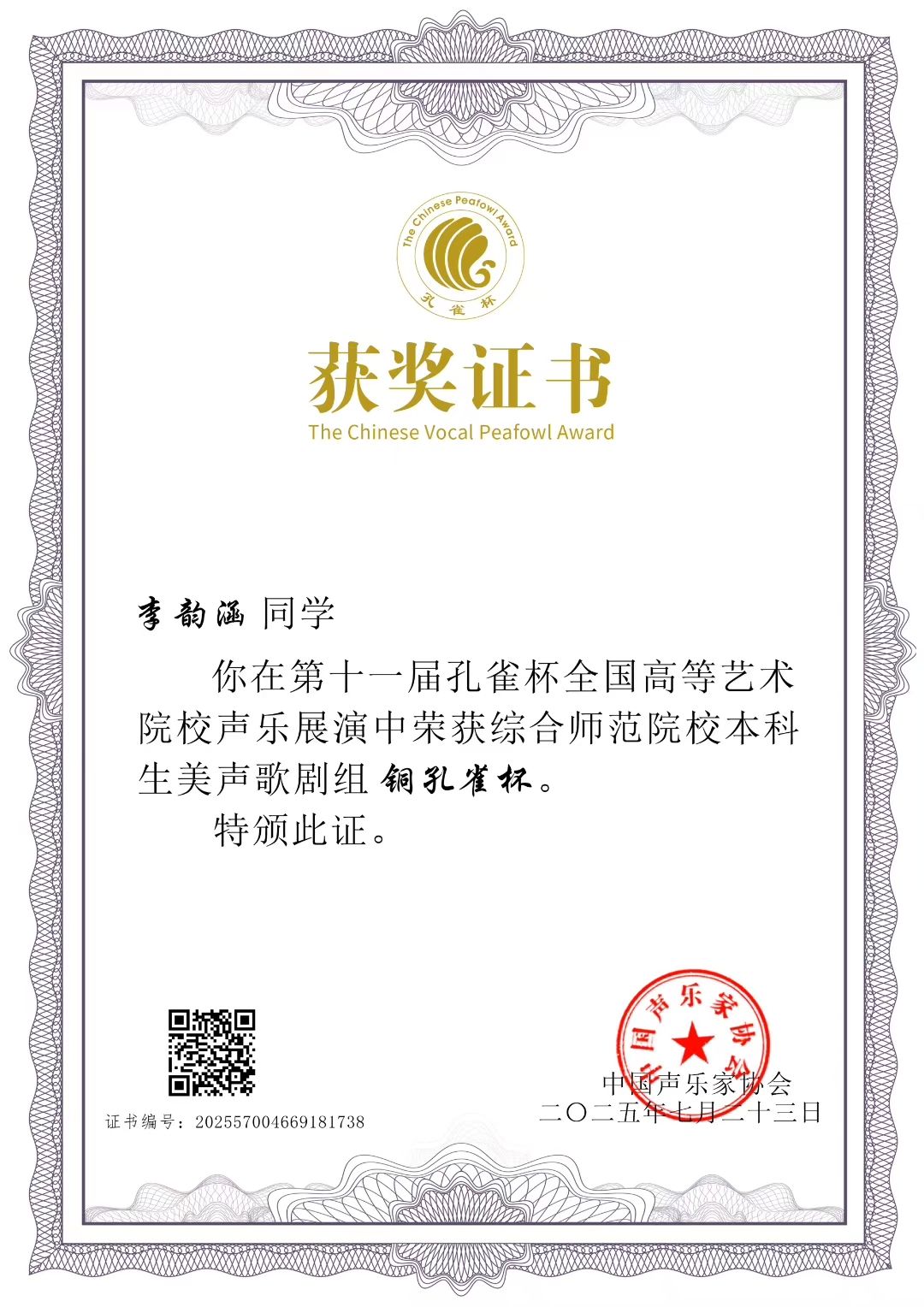2025年7月23日,从第十一届孔雀杯全国高校声乐展演现场传来喜讯,音乐学院2022级的李韵涵同学凭借出色表现,在综合师范院校本科美声歌剧组的激烈竞争中脱颖而出,斩获铜孔雀奖。