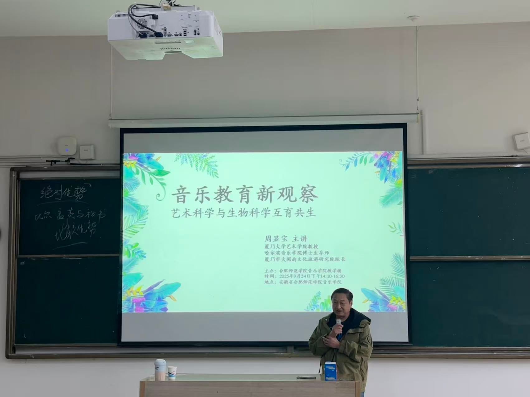 2025年9月24日下午,厦门大学周显宝教授应邀来我院,在博约楼108教室为师生带来了一场题为《音乐教育新观察》的精彩讲座。音乐学院院长李劲松、副院长康勤以及学院全体教职工出席了本次讲座,同时还吸引了近百名学生,现场学术气氛浓厚。